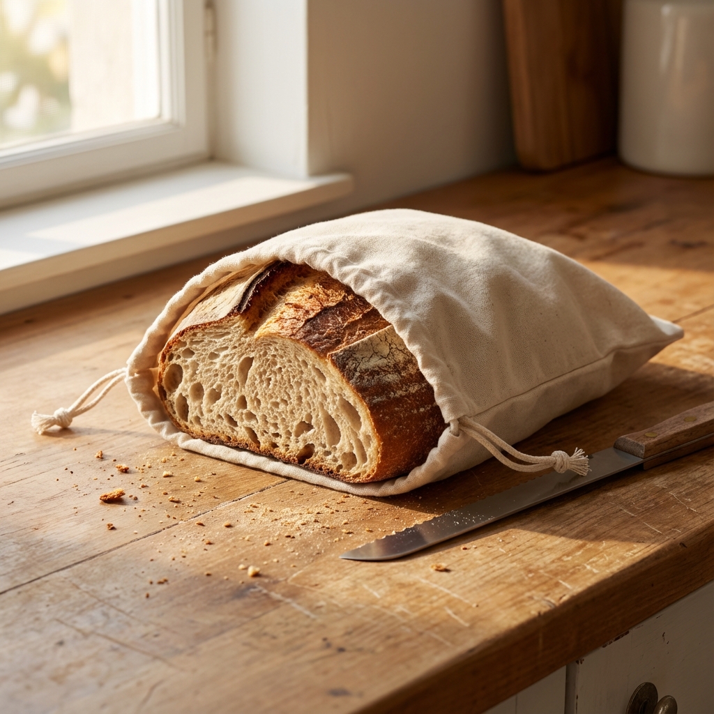 Denne brødposen lar brødet puste akkurat nok til å slippe ut fuktighet, uten at det tørker ut. Resultatet er brød som holder seg godt i flere dager, uten den myke skorpen du får i plast.